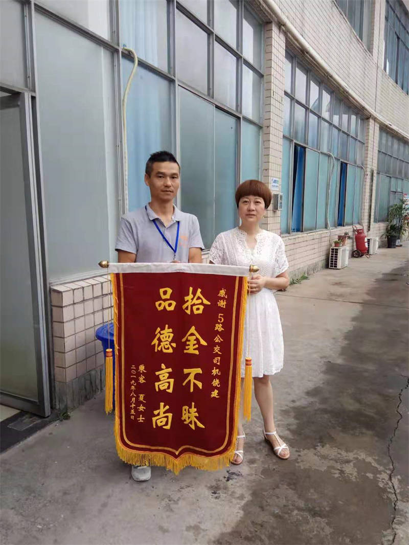 8月20日上午,市民夏女士冒著小雨來到公交總站,親手將一面寫有“拾金不昧品德高尚”的錦旗送到5路公交車司機(jī)饒建手上。送上錦旗時,夏女士口中還在不停的念叨著:“公交司機(jī)師傅很棒,真的要感謝你喲!