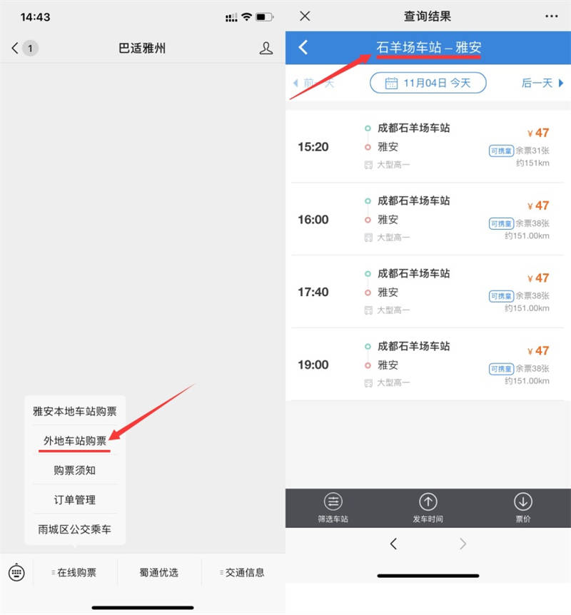 11月4日,蜀通公司線上購票平臺“巴適雅州”微信公眾號開通省內(nèi)外多地區(qū)汽車購票業(yè)務(wù)。