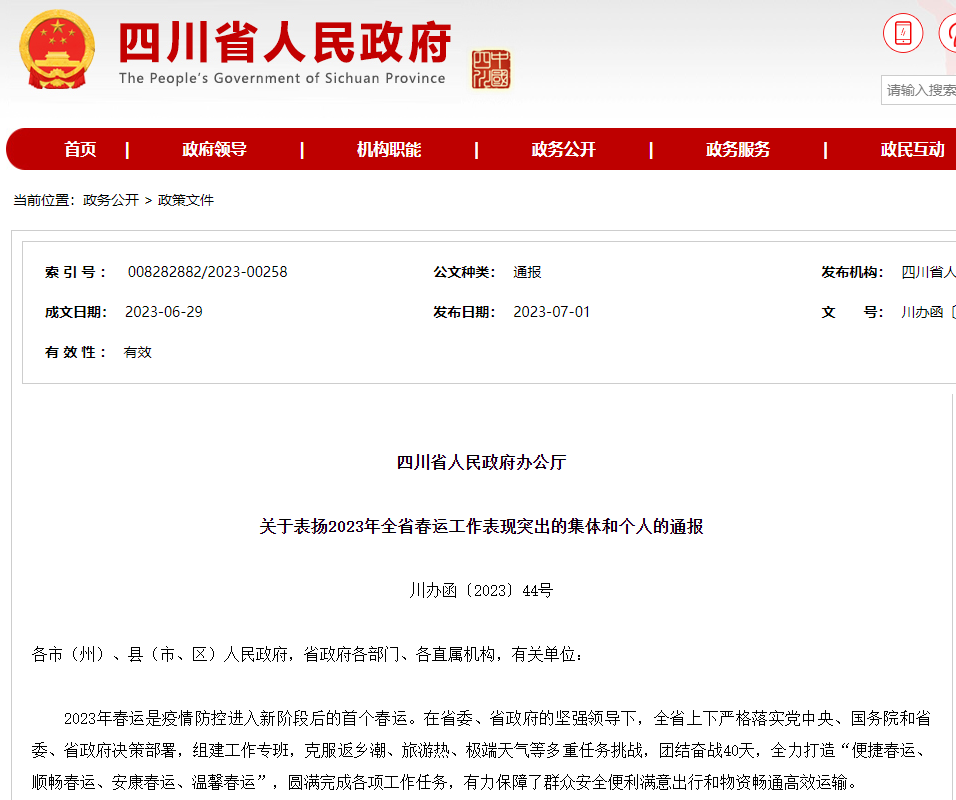 近日,四川省人民政府辦公廳印發(fā)《關(guān)于表揚(yáng)2023年全省春運工作表現(xiàn)突出的集體和個人的通報》,四川蜀通運業(yè)有限公司榮獲 “2023年全省春運工作表現(xiàn)突出集體”稱號。
