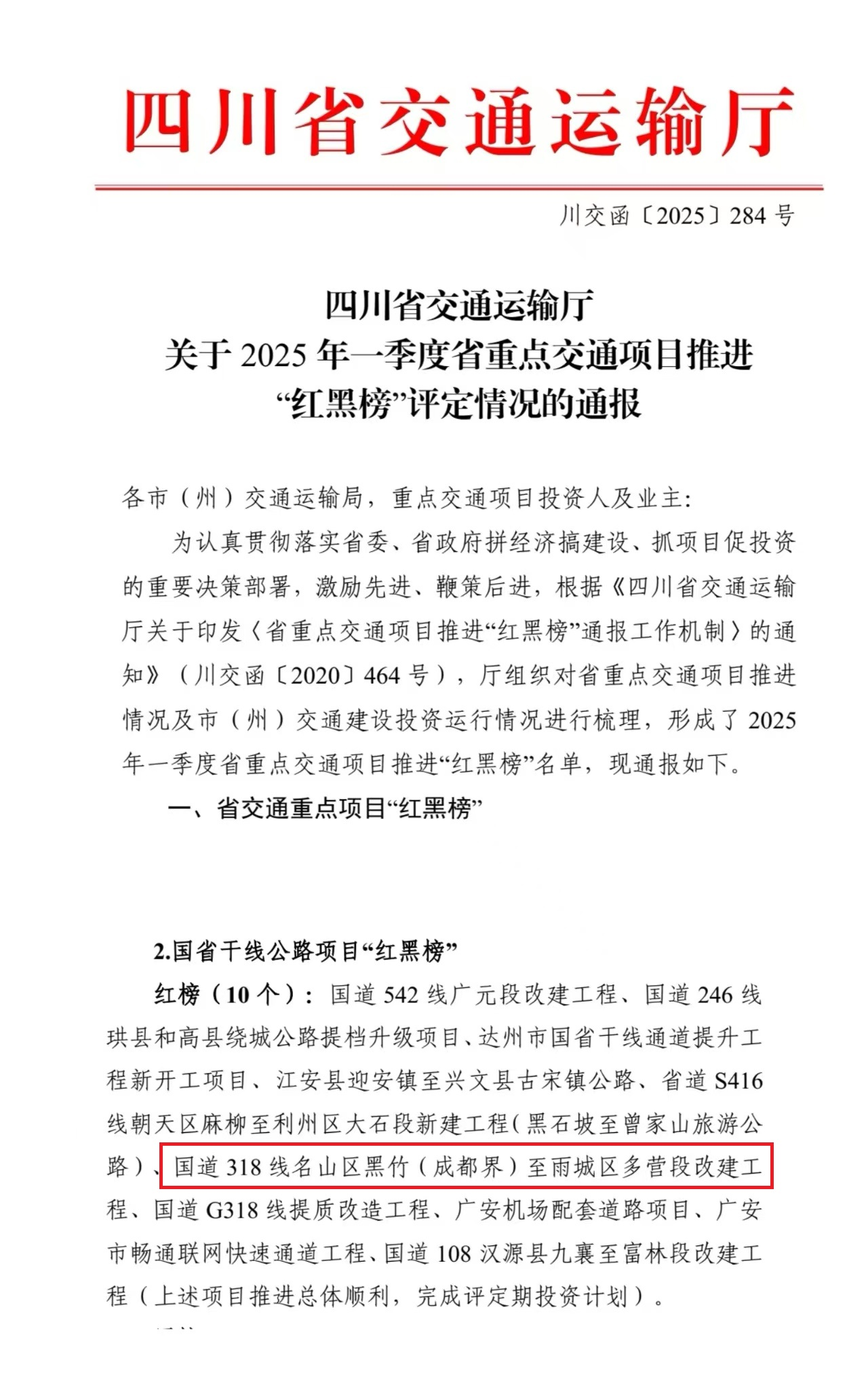 近日,四川省交通運輸廳發(fā)布2025年一季度省重點交通項目推進“紅黑榜”評選結果,由雅安交建集團四川康藏路橋有限責任公司承建的國道318線名山區(qū)黑竹(成都界)至雨城區(qū)多營段改建工程憑借超額完成投資計劃、關鍵節(jié)點取得突破等成效,成功入選國省干線公路項目“紅榜”。