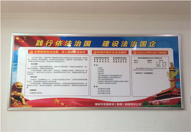 三是印發(fā)《雅安市交通建設(shè)(集團(tuán))有限責(zé)任公司依法治企法律法規(guī)文件匯編》至公司領(lǐng)導(dǎo)班子成員與高管,作為會(huì)前學(xué)法材料與自學(xué)材料;制作依法治企宣傳展板,懸掛于公司內(nèi)部進(jìn)行法治宣傳工作。