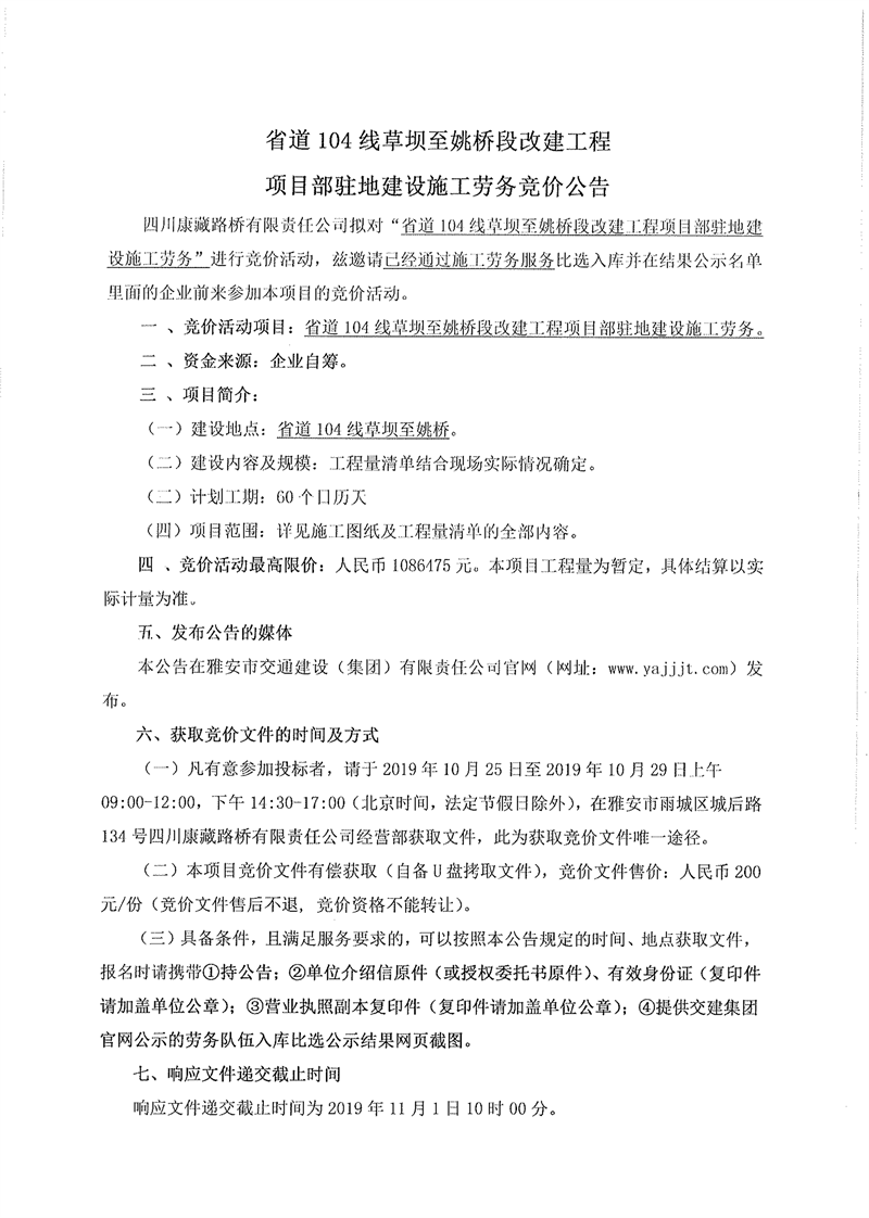 四川康藏路橋有限責任公司省道104線草壩至姚橋段改建工程項目部駐地建設施工勞務競價公告