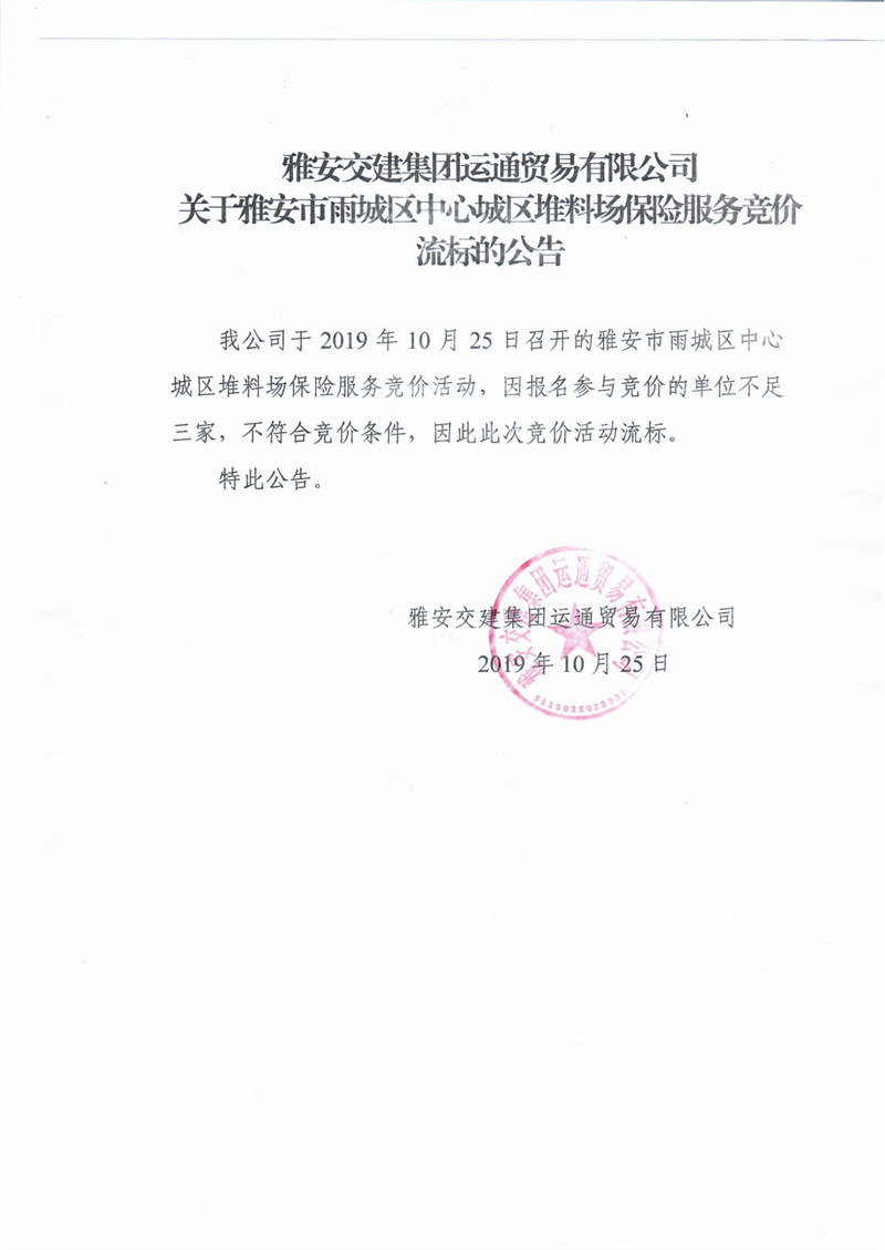 雅安交建集團運通貿(mào)易有限公司關(guān)于雅安市雨城區(qū)中心城區(qū)堆料場保險服務(wù)競價流標(biāo)的公告