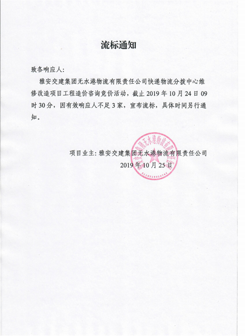 雅安交建集團(tuán)無水港物流有限責(zé)任公司快遞物流分撥中心維修改造項目工程造價咨詢競價流標(biāo)通知