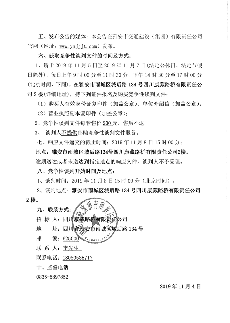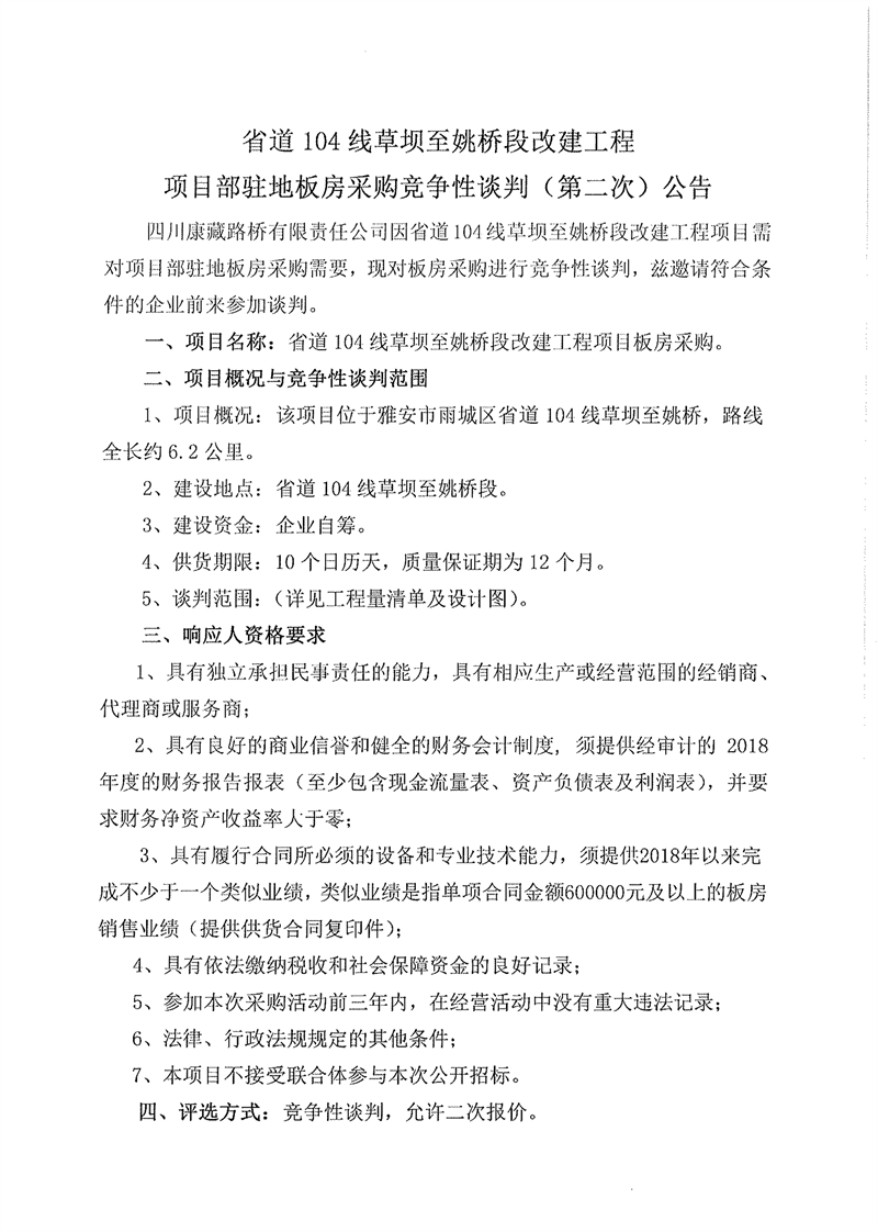 四川康藏路橋有限責(zé)任公司省道104線草壩至姚橋段改建工程項(xiàng)目部駐地板房采購競爭性談判(第二次)公告