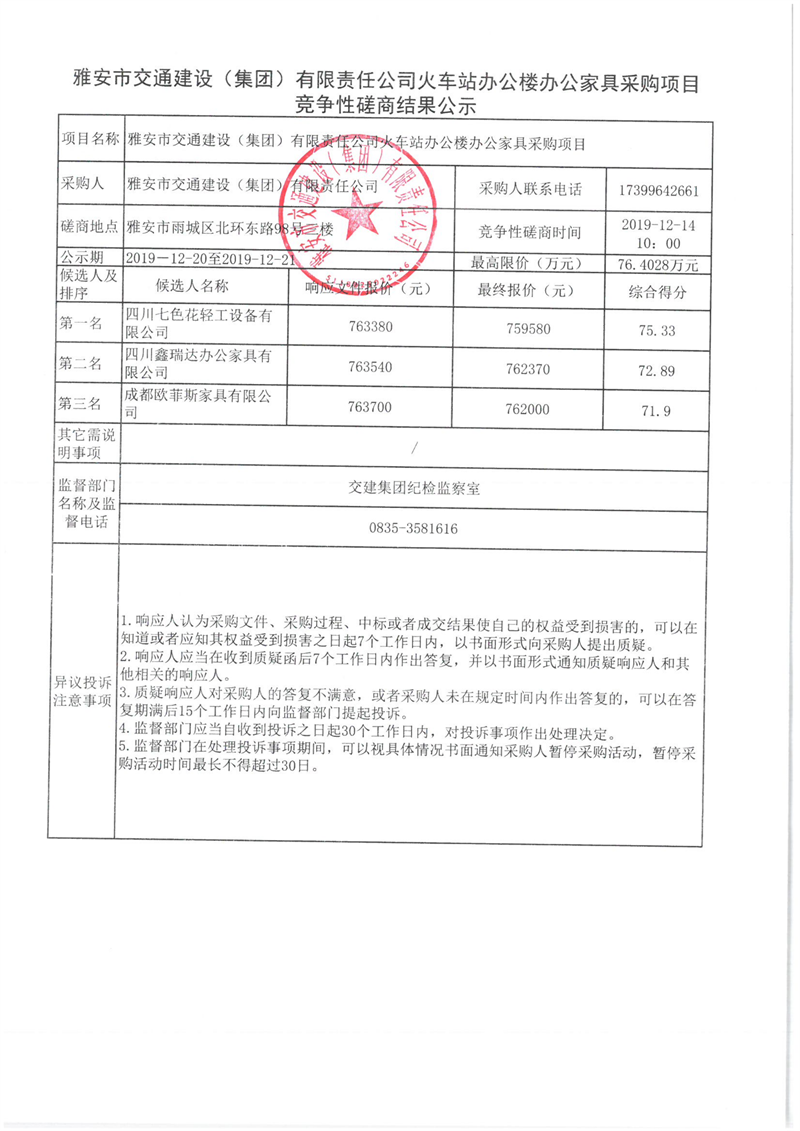 雅安市交通建設(shè)(集團(tuán))有限責(zé)任公司火車站辦公樓辦公家具采購項目競爭性磋商結(jié)果公示