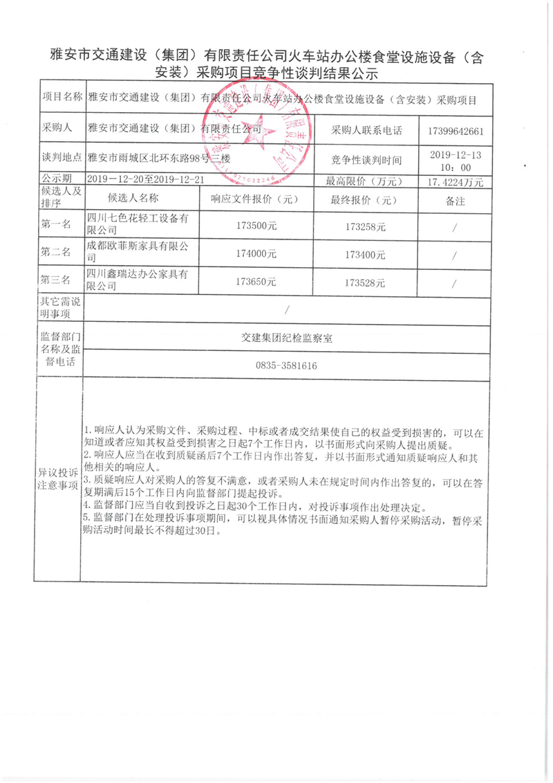 雅安市交通建設(shè)(集團(tuán))有限責(zé)任公司火車站辦公樓食堂設(shè)施設(shè)備(含安裝)采購項(xiàng)目競爭性談判結(jié)果公示