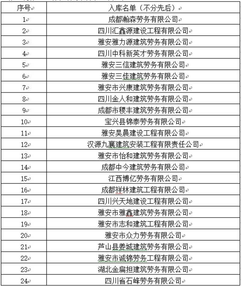 雅安交建集團路橋有限責任公司勞務服務入庫比選項目于2019年5月11日完成開評標工作,現(xiàn)將比選結果即入庫名單公示如下:
