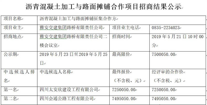 雅安交建集團(tuán)路橋有限責(zé)任公司瀝青混凝土加工與路面攤鋪合作項目招商結(jié)果公告