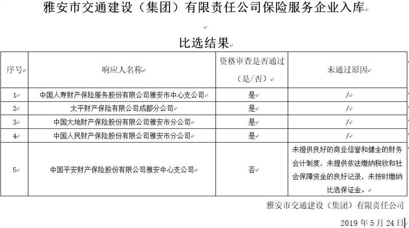 雅安市交通建設(shè)(集團(tuán))有限責(zé)任公司保險服務(wù)企業(yè)入庫比選結(jié)果公示