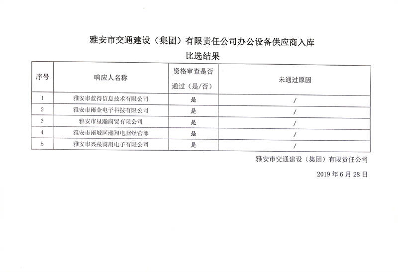 雅安市交通建設(shè)(集團(tuán))有限責(zé)任公司辦公設(shè)備供應(yīng)商入庫(kù)比選結(jié)果