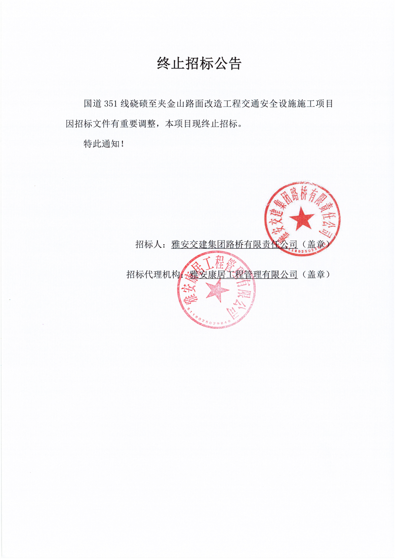 雅安交建集團路橋有限責任公司國道351線磽磧至夾金山段路面改造工程交通安全設施施工項目終止招標公告
