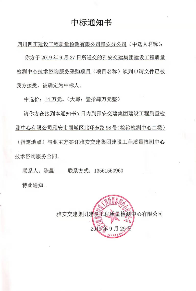 雅安交建集團(tuán)建設(shè)工程質(zhì)量檢測(cè)中心技術(shù)咨詢服務(wù)采購(gòu)項(xiàng)目中標(biāo)公示