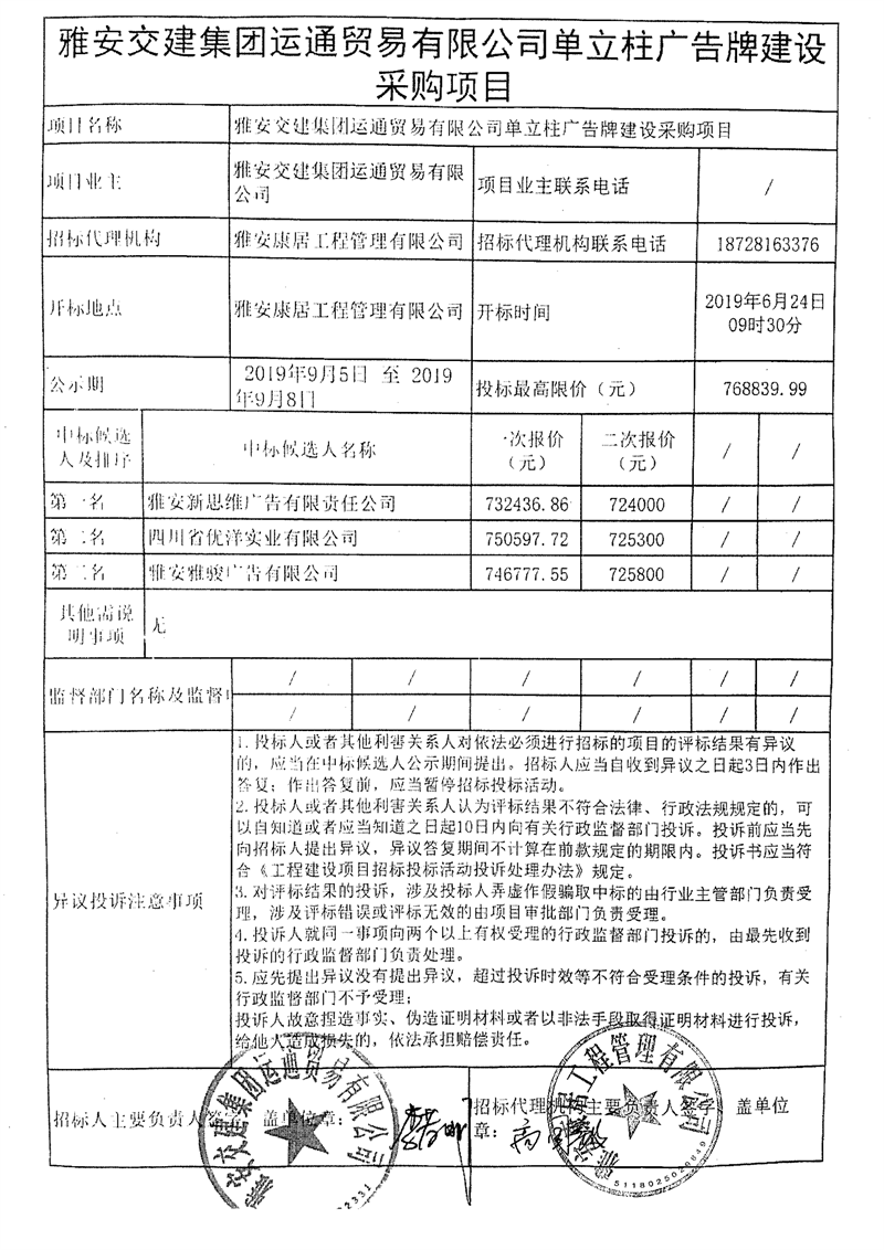 雅安交建集團(tuán)運(yùn)通貿(mào)易有限公司單立柱廣告牌建設(shè)采購項(xiàng)目競(jìng)爭(zhēng)性談判結(jié)果公示