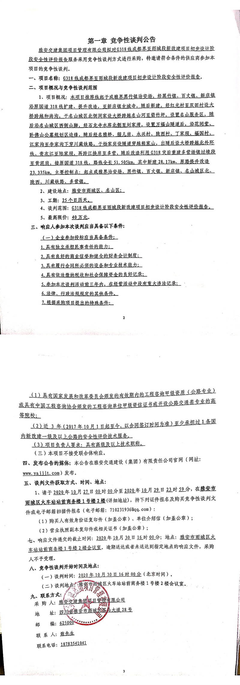 雅安交建集團(tuán)項(xiàng)目管理有限公司G318線成都界至雨城段新改建項(xiàng)目初步設(shè)計(jì)階段安全性評(píng)價(jià)報(bào)告競(jìng)爭(zhēng)性談判公告