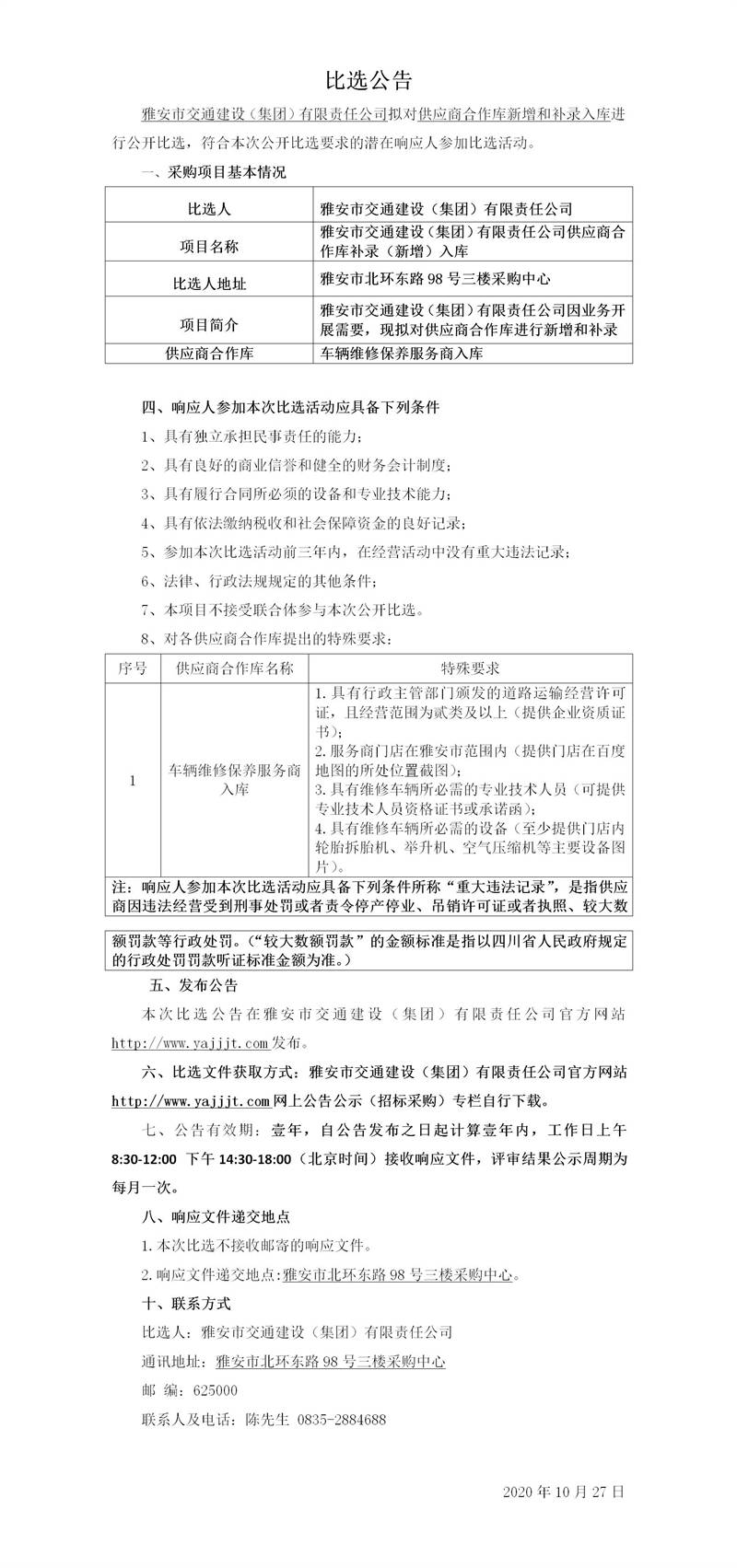雅安市交通建設(shè)(集團(tuán))有限責(zé)任公司供應(yīng)商合作庫補(bǔ)錄(新增)入庫比選公告