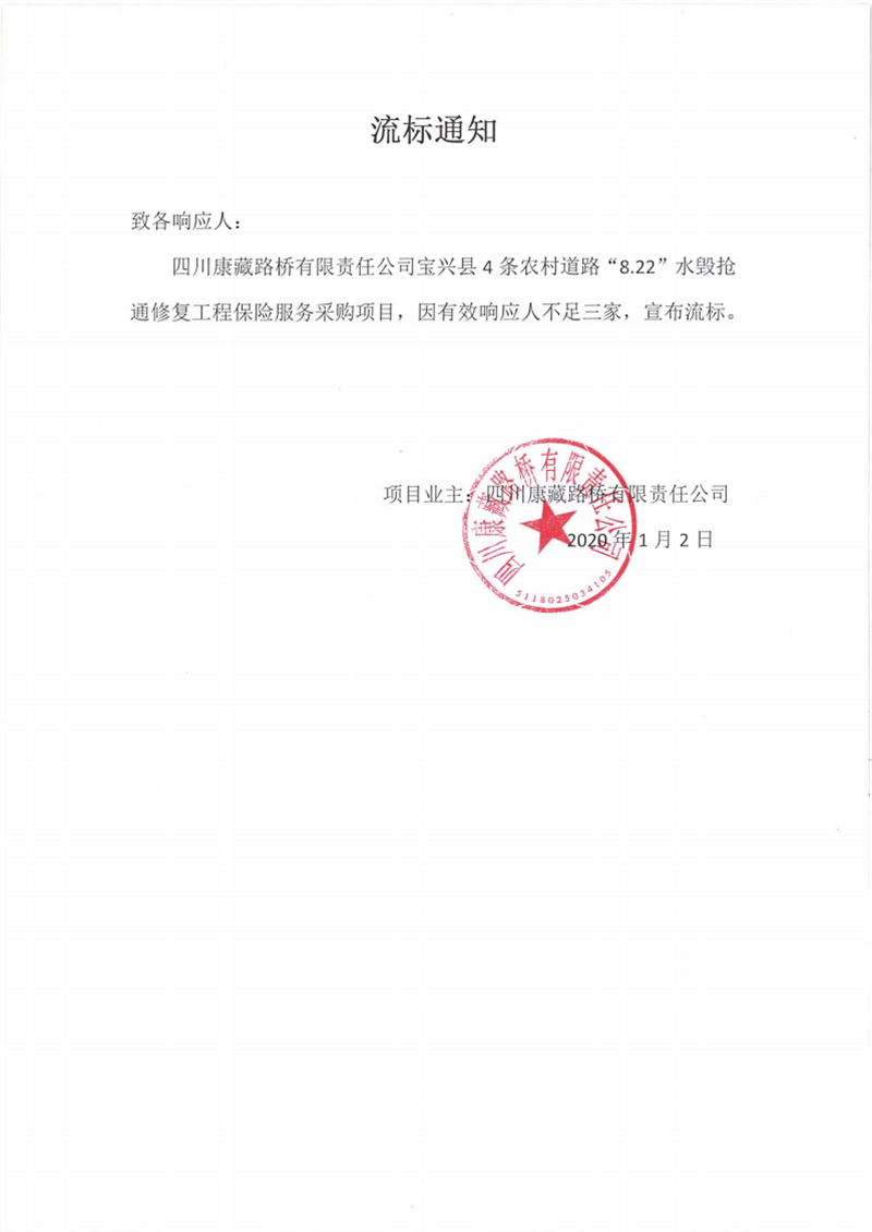 四川康藏路橋有限責(zé)任公司寶興縣4條農(nóng)村道路“8.22”水毀搶通修復(fù)工程保險服務(wù)采購項目流標通知
