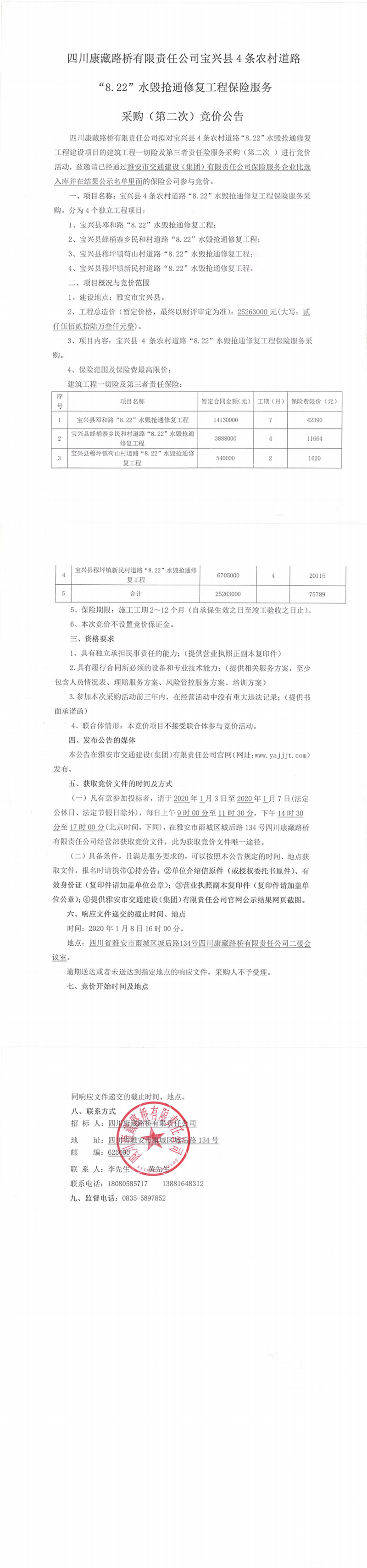 四川康藏路橋有限責任公司寶興縣4條農(nóng)村道路“8.22”水毀搶通修復工程保險服務采購(第二次)競價公告