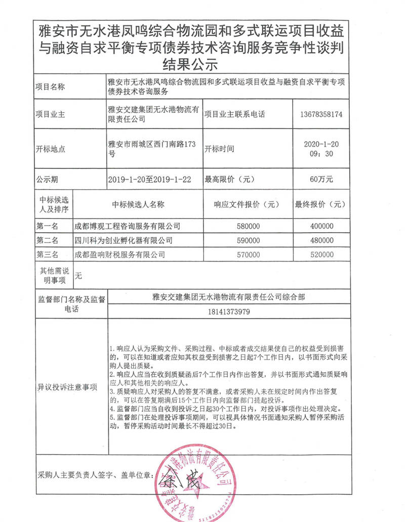 雅安市無水港鳳鳴綜合物流園和多式聯(lián)運(yùn)項(xiàng)目收益與融資自求平衡專項(xiàng)債券技術(shù)咨詢服務(wù)競(jìng)爭(zhēng)性談判結(jié)果公示