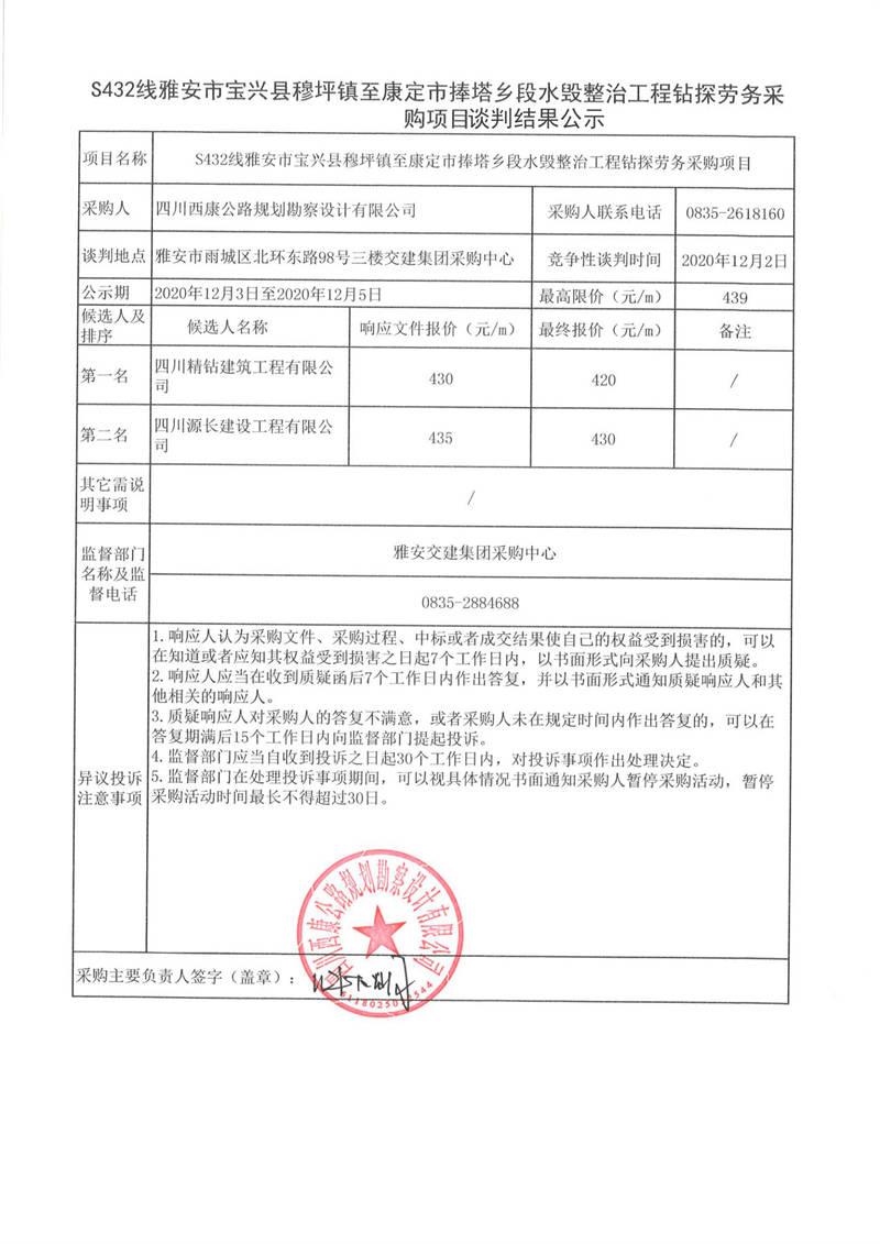 四川西康公路規(guī)劃勘察設(shè)計(jì)有限公司S432線(xiàn)雅安市寶興縣穆坪鎮(zhèn)至康定市捧塔鄉(xiāng)段水毀整治工程鉆探勞務(wù)采購(gòu)項(xiàng)目談判結(jié)果公示