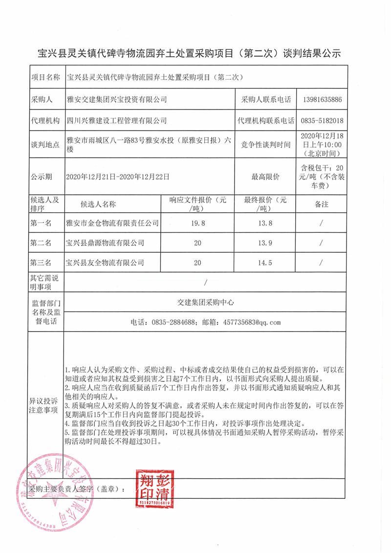 雅安交建集團(tuán)興寶投資有限公司寶興縣靈關(guān)鎮(zhèn)代碑寺物流園棄土處置采購項目(第二次)談判結(jié)果公示