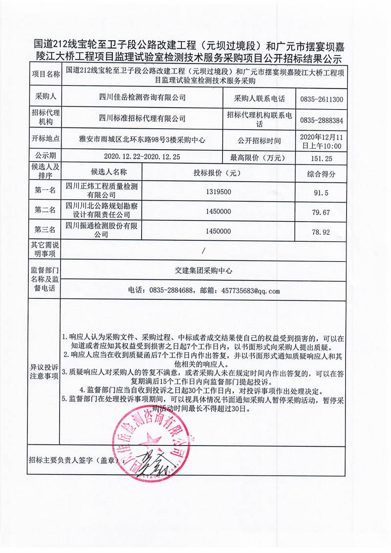 四川佳岳檢測(cè)咨詢(xún)有限公司國(guó)道212線(xiàn)寶輪至衛(wèi)子段公路改建工程(元壩過(guò)境段)和廣元市擺宴壩嘉陵江大橋工程項(xiàng)目監(jiān)理試驗(yàn)室檢測(cè)技術(shù)服務(wù)采購(gòu)項(xiàng)目公開(kāi)招標(biāo)結(jié)果公示