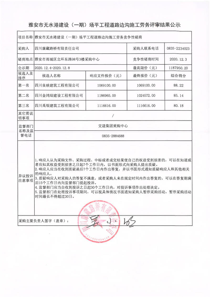 四川康藏路橋有限責(zé)任公司雅安市無水港建設(shè)(一期)場(chǎng)平工程道路邊溝施工勞務(wù)評(píng)審結(jié)果公示