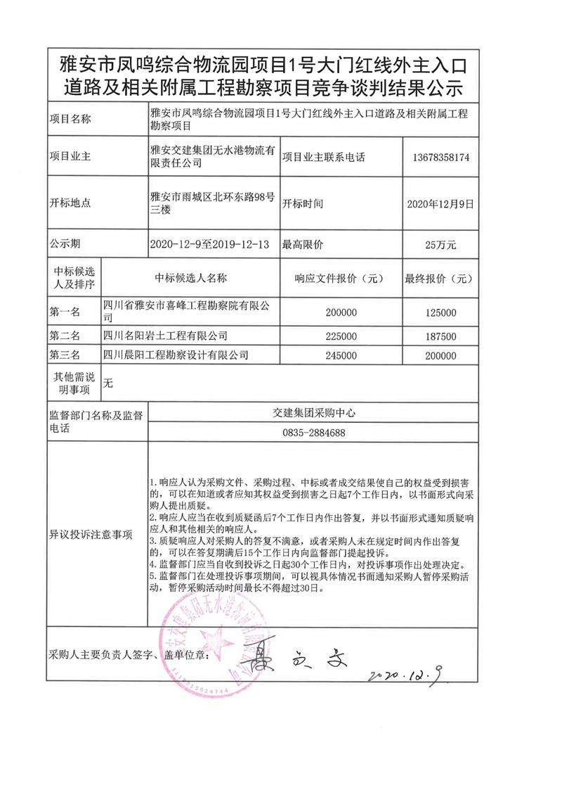 雅安交建集團(tuán)無(wú)水港物流有限責(zé)任公司雅安市鳳鳴綜合物流園項(xiàng)目1號(hào)大門(mén)紅線外主入口道路及相關(guān)附屬工程勘察項(xiàng)目競(jìng)爭(zhēng)談判結(jié)果公示