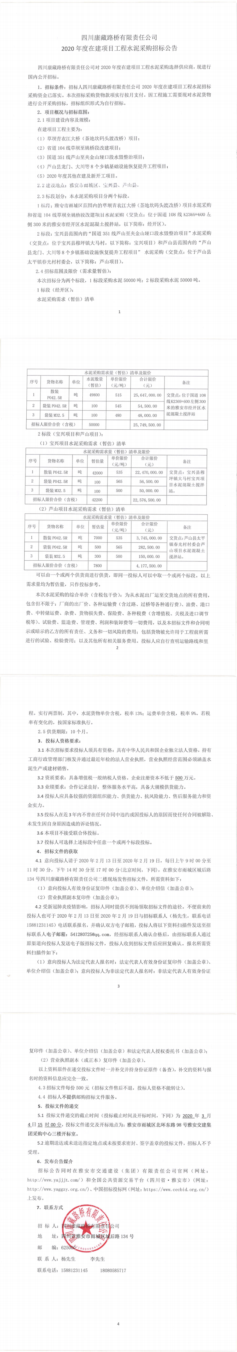 四川康藏路橋有限責(zé)任公司2020年度在建項目工程水泥采購招標(biāo)公告