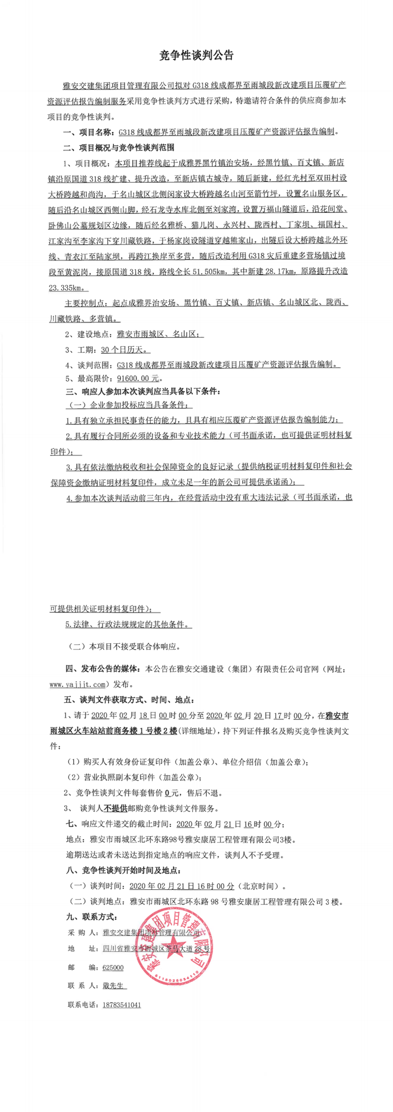 雅安交建集團(tuán)項(xiàng)目管理有限公司G318線成都界至雨城段新改建項(xiàng)目壓覆礦產(chǎn)資源評估報告編制競爭性談判公告