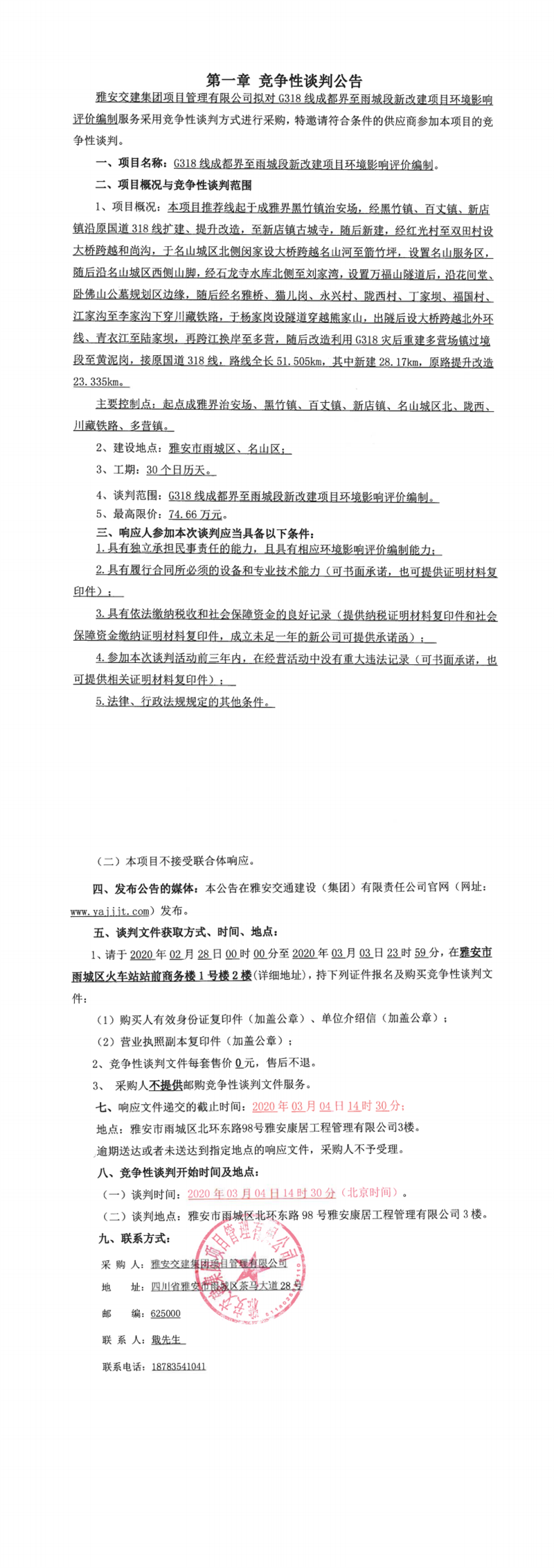 雅安交建集團(tuán)項(xiàng)目管理有限公司G318線成都界至雨城段新改建項(xiàng)目環(huán)境影響評價編制競爭性談判公告