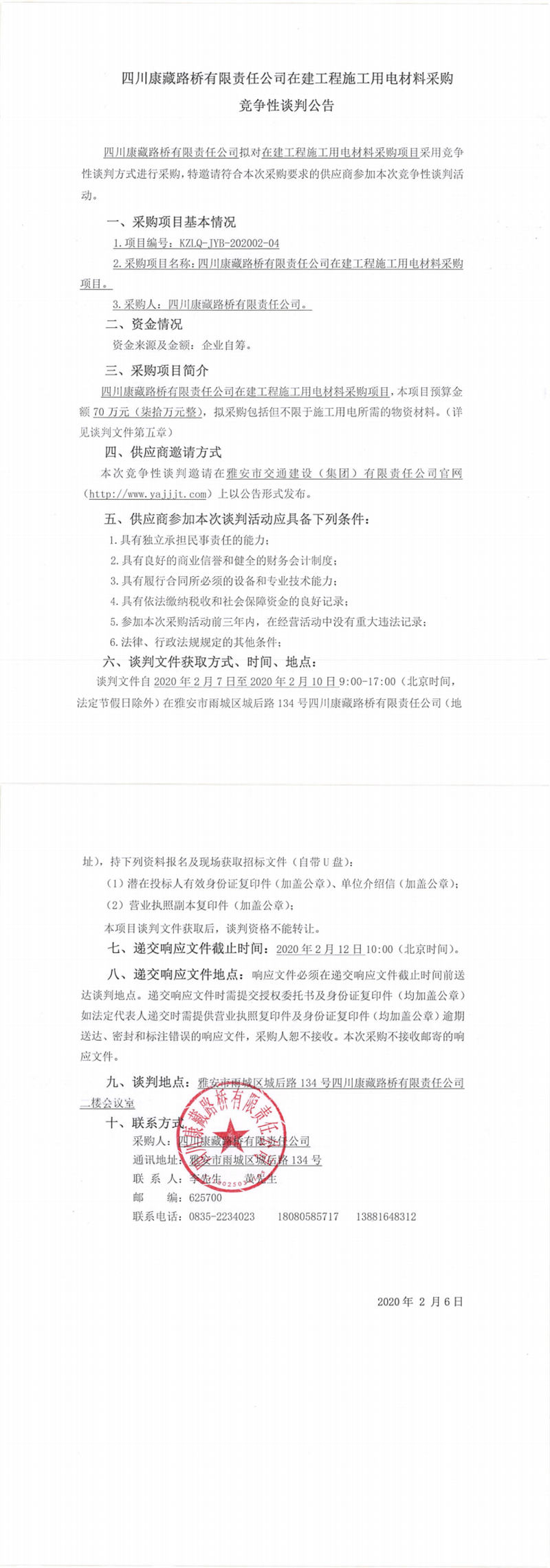 四川康藏路橋有限責(zé)任公司在建工程施工用電材料采購競爭性談判公告