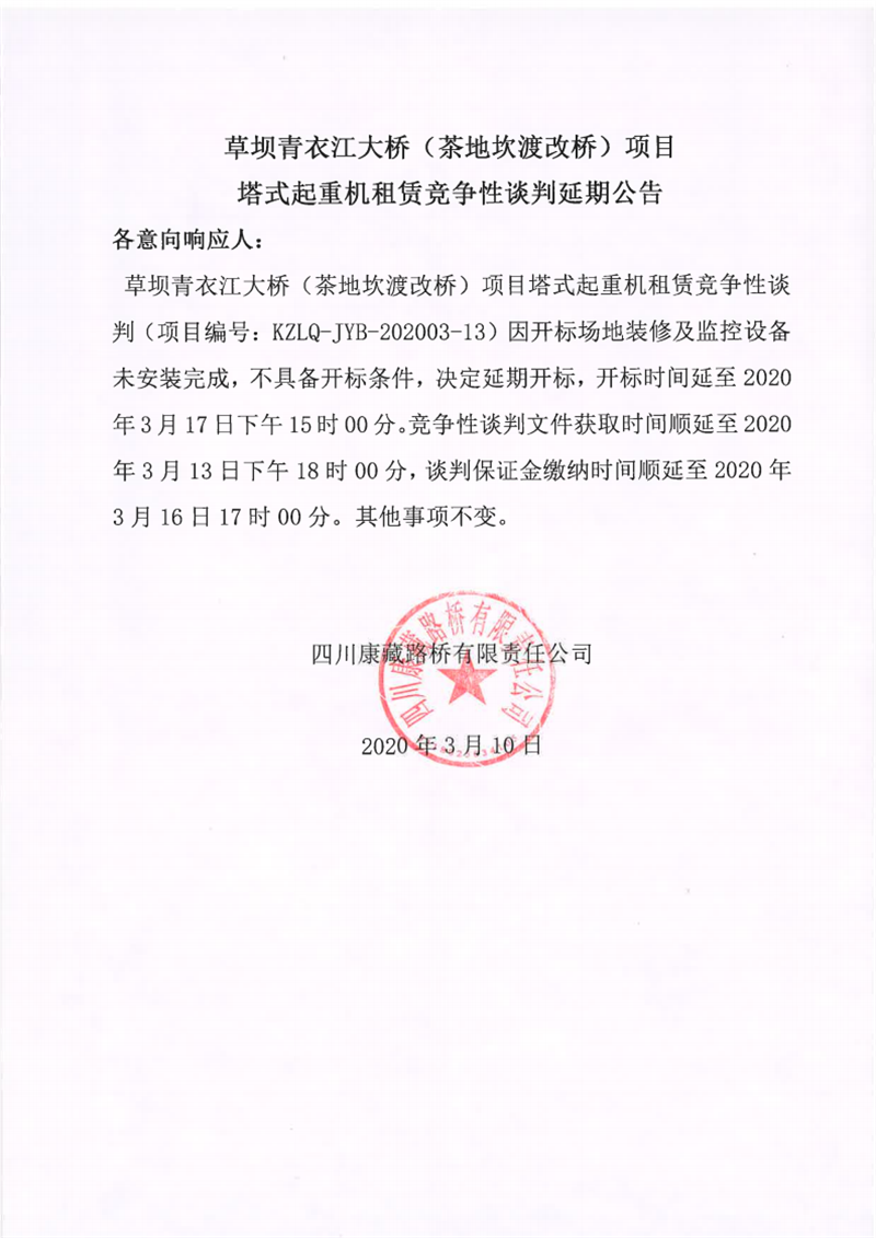 四川康藏路橋有限責任公司草壩青衣江大橋(茶地坎碼頭渡改橋)項目塔式起重機租賃競爭性談判延期公告