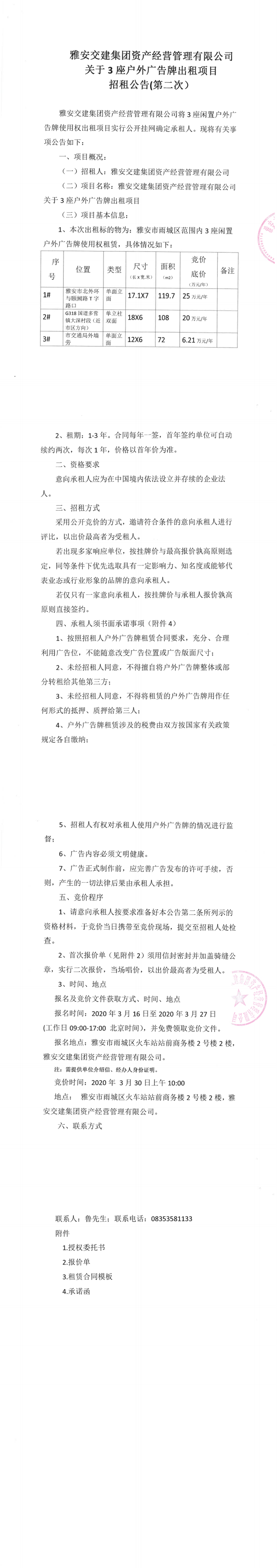 雅安交建集團(tuán)資產(chǎn)經(jīng)營(yíng)管理有限公司關(guān)于3座戶外廣告牌出租項(xiàng)目招租公告(第二次)