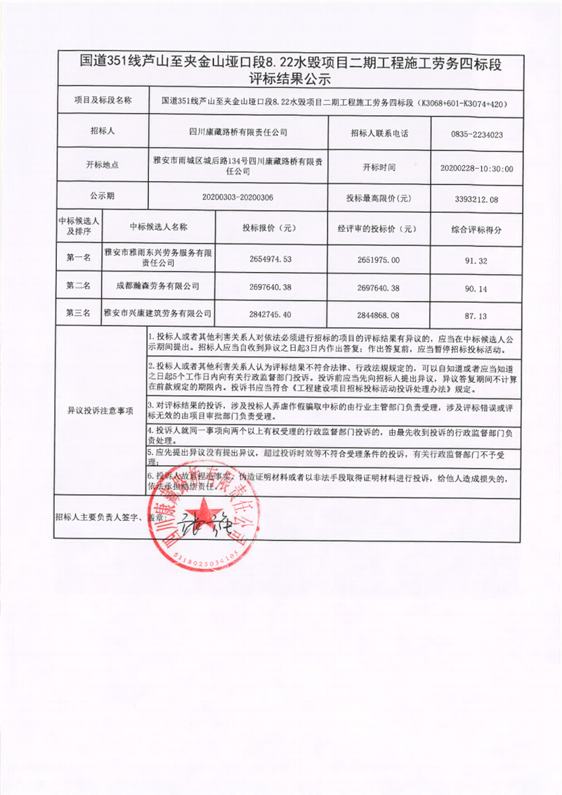 四川康藏路橋有限責(zé)任公司國道351線蘆山至夾金山埡口段8.22水毀項目二期工程施工勞務(wù)四標(biāo)段評標(biāo)結(jié)果公示