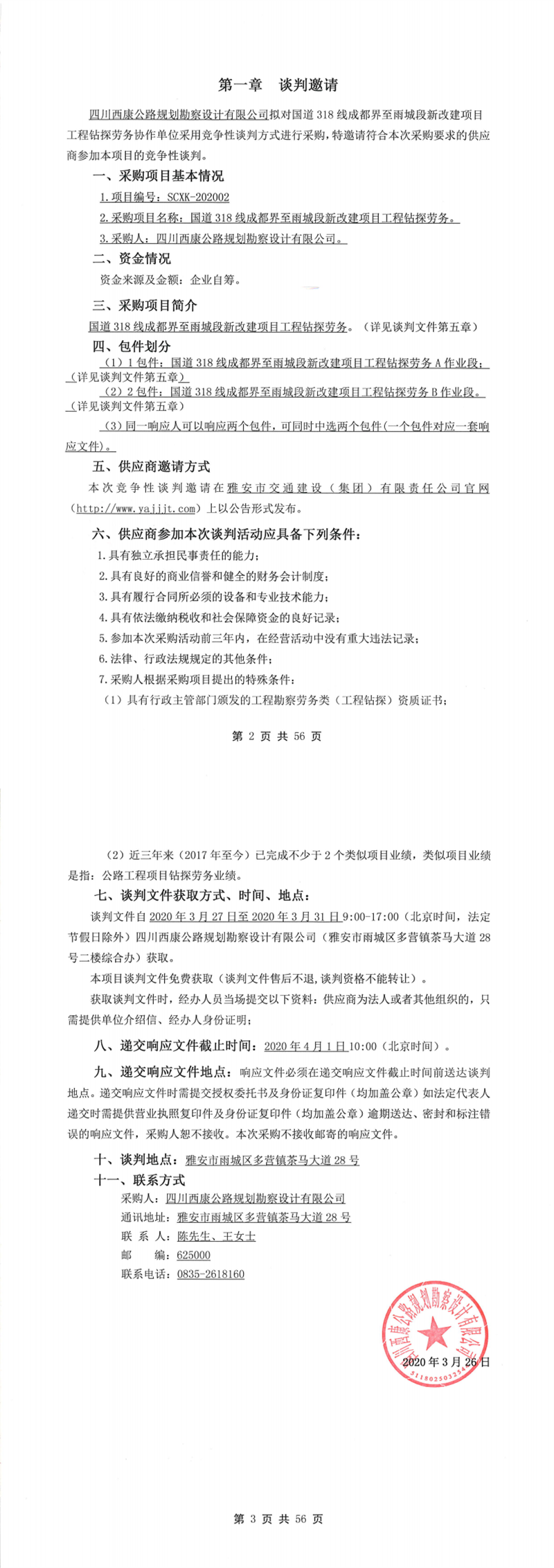四川西康公路規(guī)劃勘察設(shè)計有限公司國道318線成都界至雨城段新改建項目工程鉆探勞務(wù)競爭性談判公告