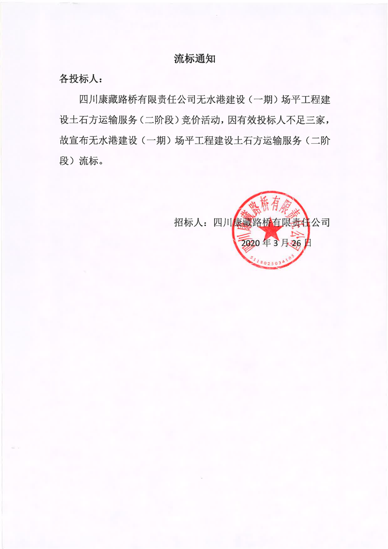 四川康藏路橋有限責(zé)任公司無水港建設(shè)(一期)場平工程建設(shè)土石方運(yùn)輸服務(wù)(二階段)流標(biāo)通知