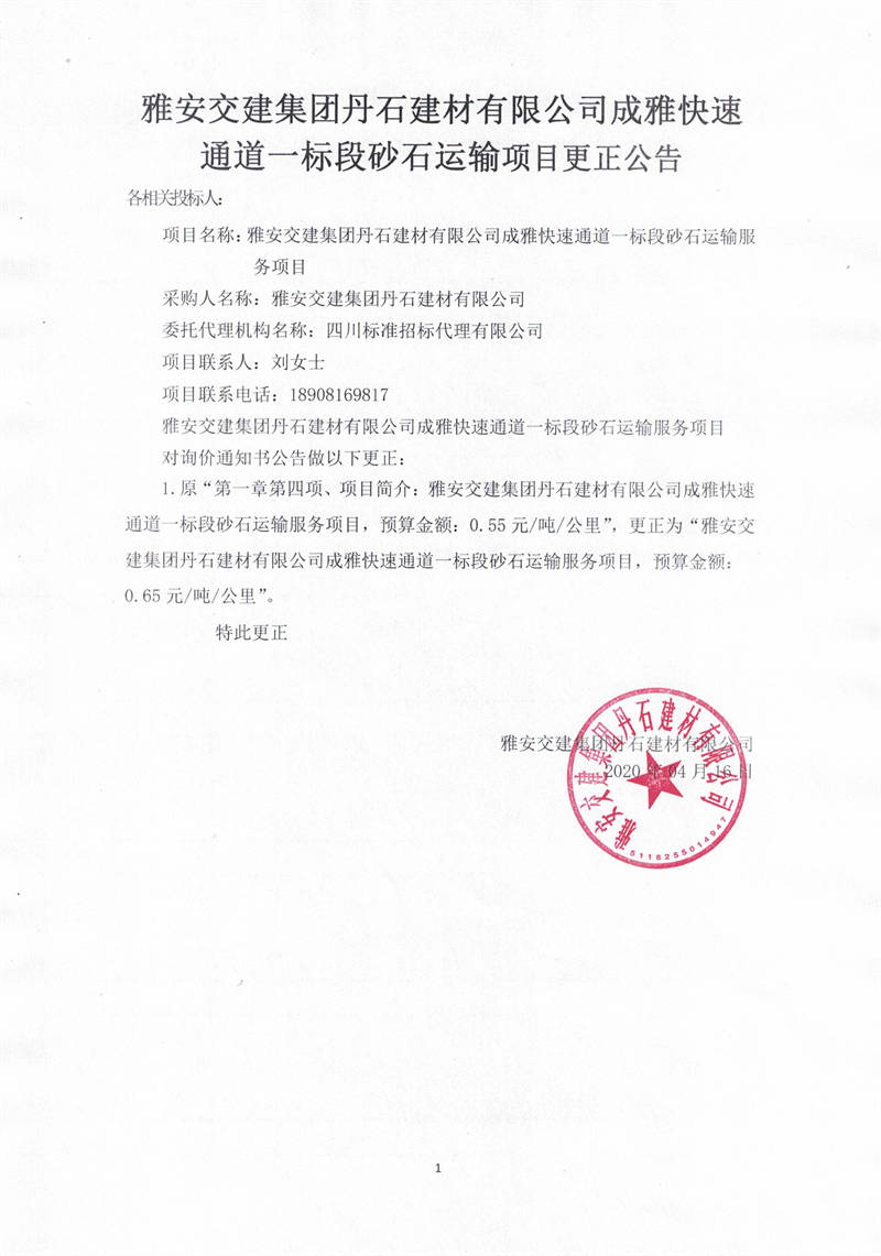 雅安交建集團丹石建材有限公司成雅快速通道一標(biāo)段砂石運輸服務(wù)項目更正公告