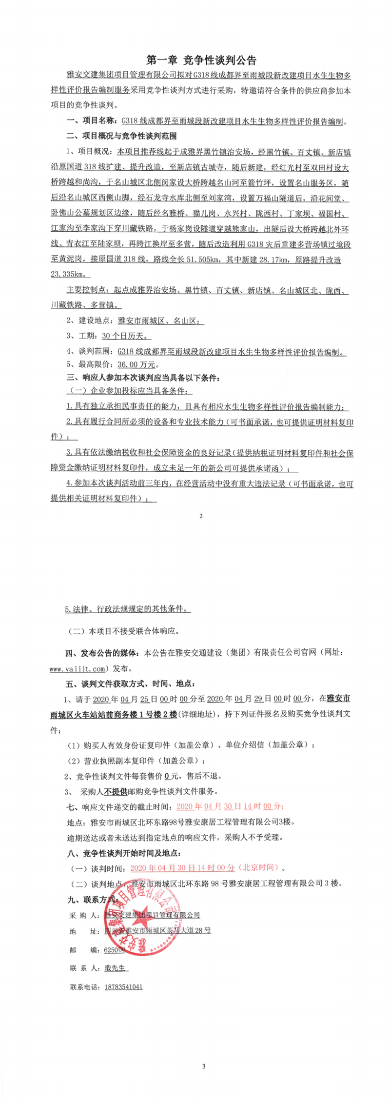 雅安交建集團(tuán)項(xiàng)目管理有限公司G318線成都界至雨城段新改建項(xiàng)目水生生物多樣性影響評(píng)價(jià)編制競爭性談判公告