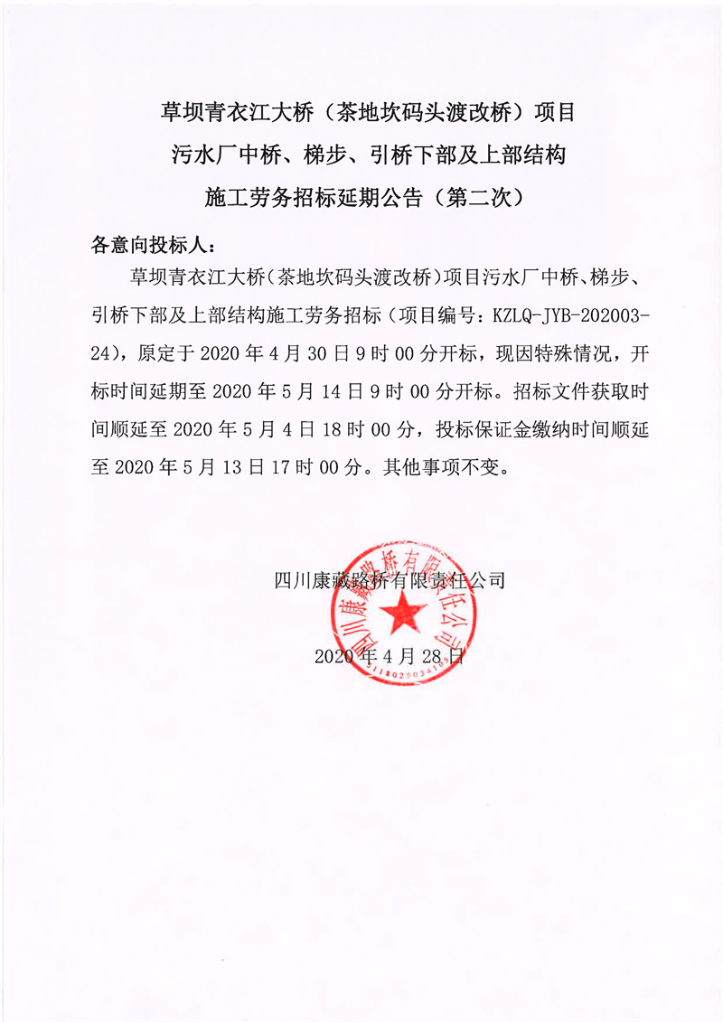 四川康藏路橋有限責任公司草壩青衣江大橋(茶地坎碼頭渡改橋)項目污水廠中橋、梯步、引橋下部及上部結(jié)構(gòu)施工勞務招標延期公告(第二次)