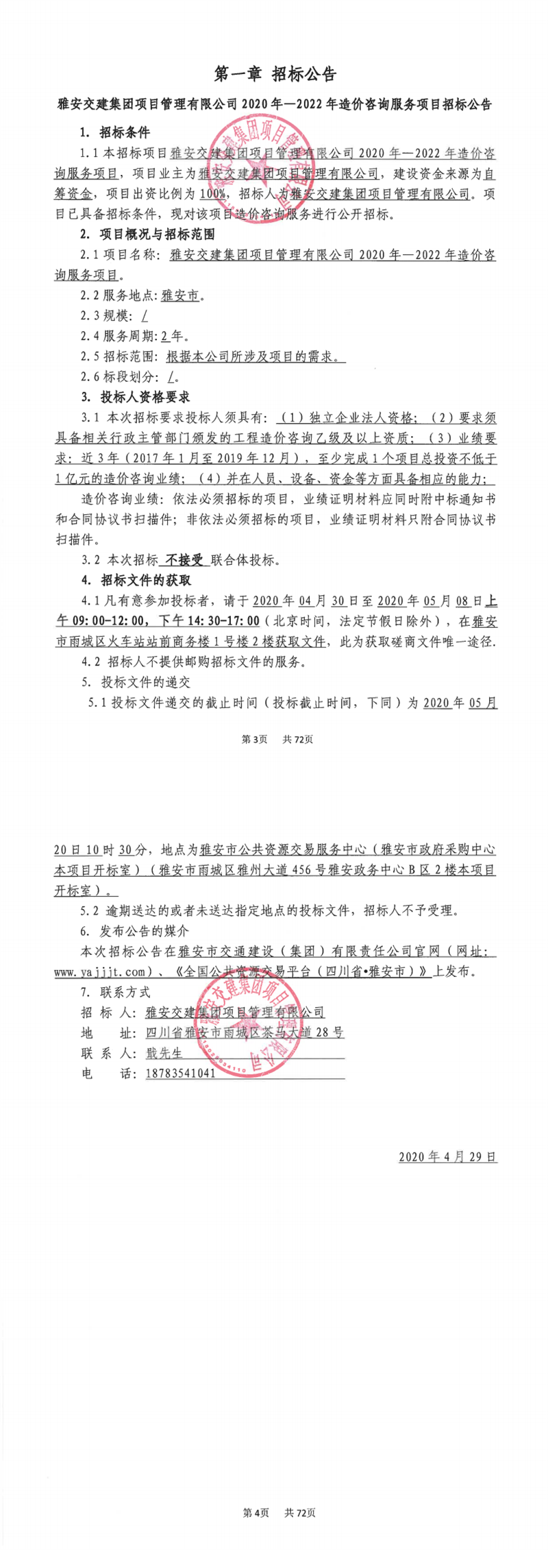 雅安交建集團項目管理有限公司2020年-2022年造價咨詢服務(wù)項目招標(biāo)公告