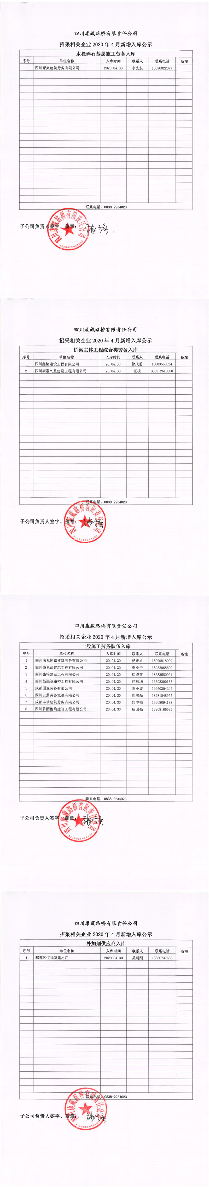 四川康藏路橋有限責任公司招采相關企業(yè)2020年4月新增入庫公示