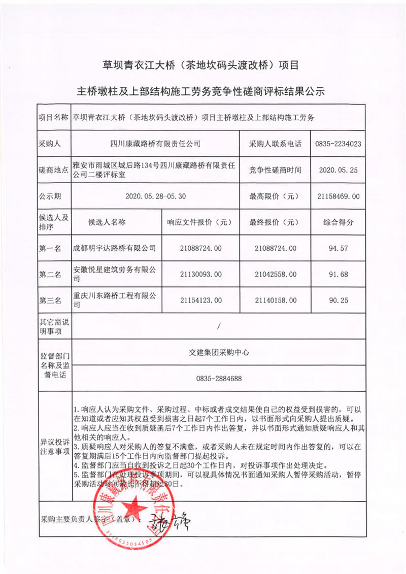 四川康藏路橋有限責(zé)任公司草壩青衣江大橋(茶地坎碼頭渡改橋)項(xiàng)目主橋墩柱及上部結(jié)構(gòu)施工勞務(wù)競(jìng)爭(zhēng)性磋商評(píng)標(biāo)結(jié)果公示