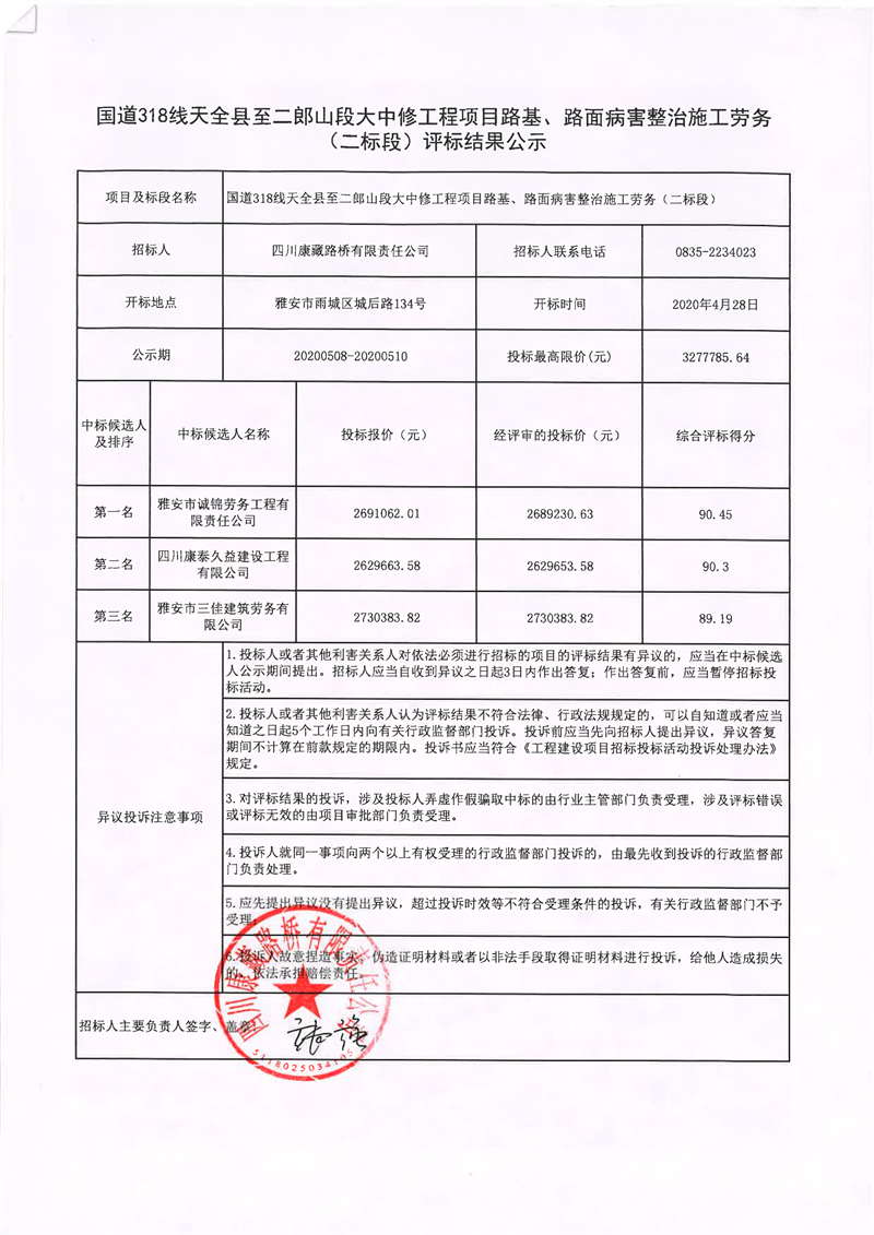 四川康藏路橋有限責(zé)任公司國(guó)道318線天全縣至二郎山段大中修工程項(xiàng)目路基、路面病害整治施工勞務(wù)(二標(biāo)段)評(píng)標(biāo)結(jié)果公示