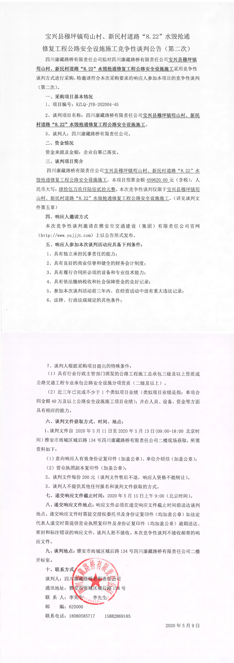 四川康藏路橋有限責(zé)任公司寶興縣穆坪鎮(zhèn)茍山村、新民村道路“8.22”水毀搶通修復(fù)工程公路安全設(shè)施施工競(jìng)爭(zhēng)性談判公告(第二次)