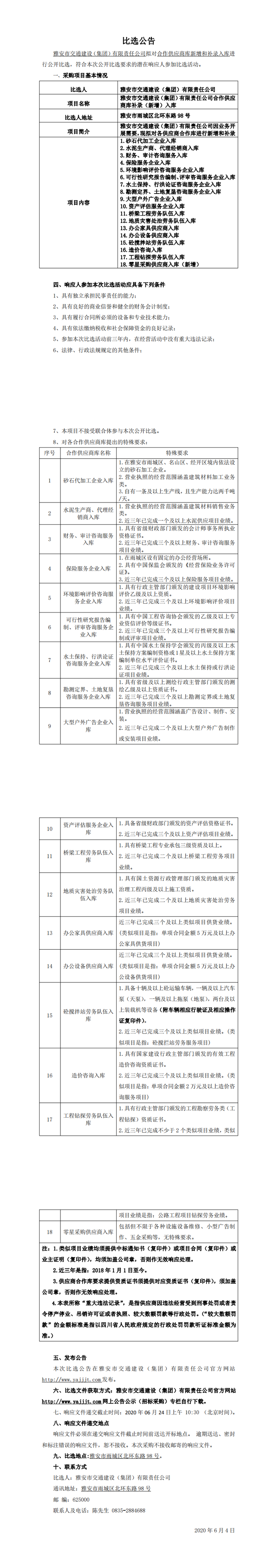 雅安市交通建設(shè)(集團)有限責任公司合作供應(yīng)商庫補錄(新增)入庫比選公告