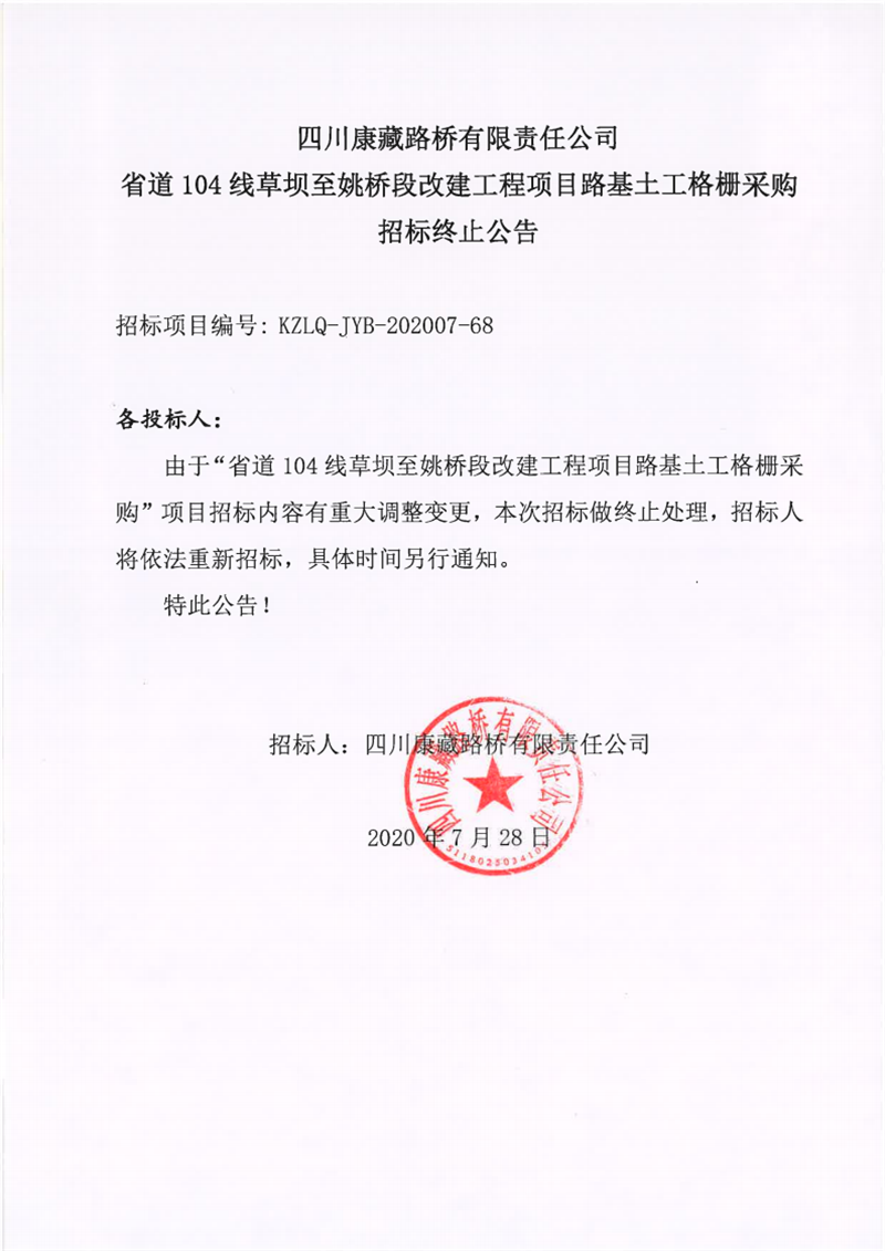 四川康藏路橋有限公司省道104線草壩至姚橋段改建工程項(xiàng)目路基土工格柵采購招標(biāo)終止公告
