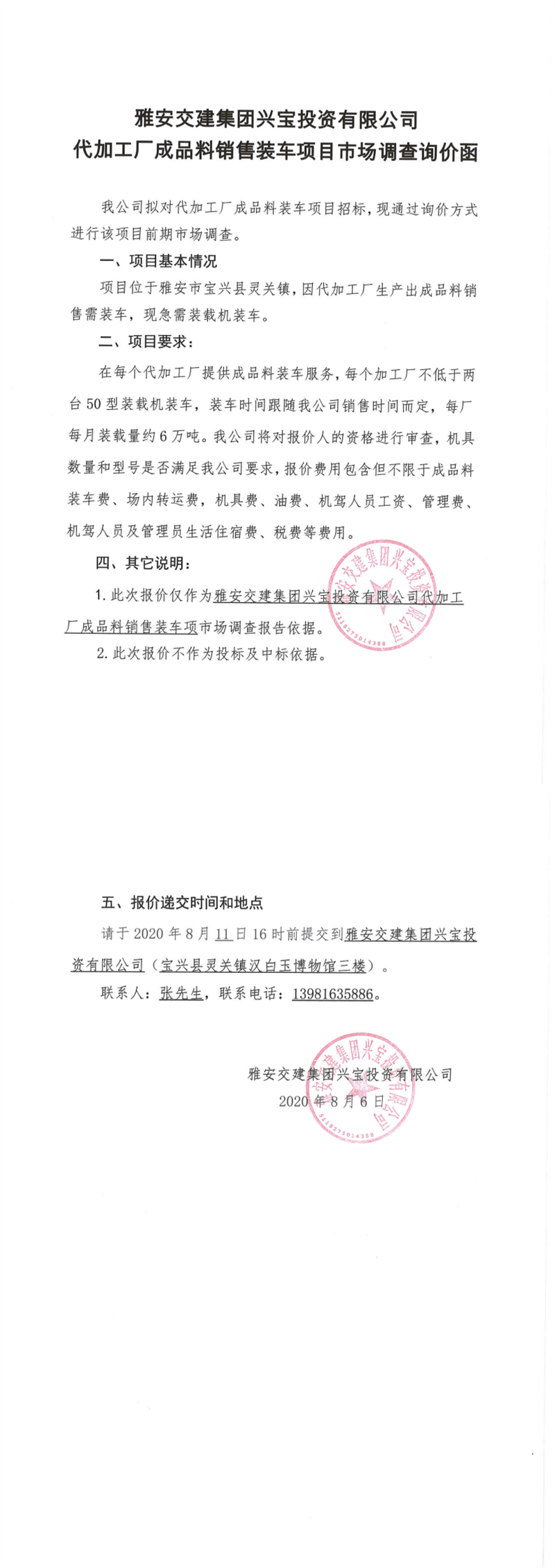 雅安交建集團興寶投資有限公司代加工成品料銷售裝車項目市場調(diào)查詢價函
