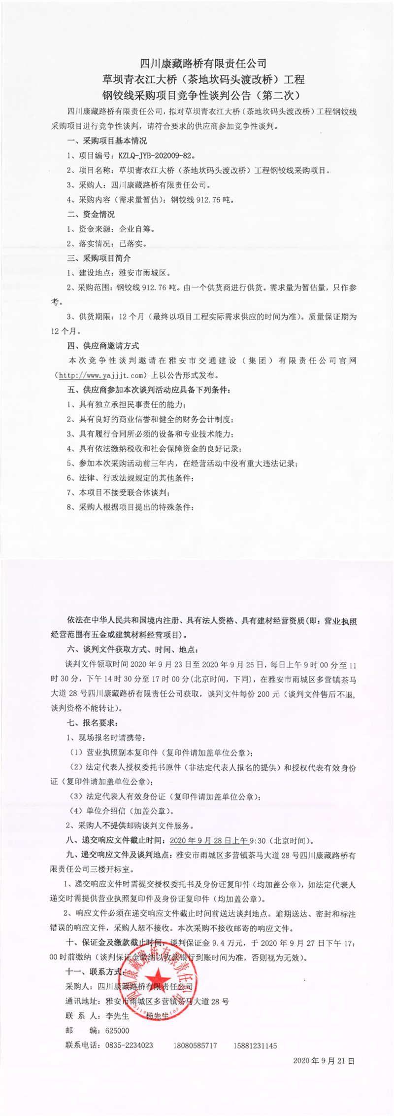 四川康藏路橋有限公司草壩青衣江大橋(茶地坎碼頭渡改橋)工程鋼鉸線采購項目競爭性談判公告(第二次)