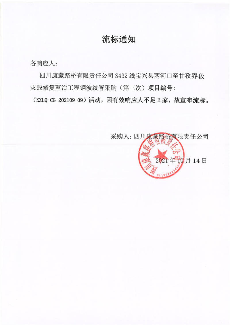 四川康藏路橋有限責(zé)任公司S432線寶興縣兩河口至甘孜界段災(zāi)毀修復(fù)整治工程鋼波紋管采購(第三次)競價(jià)公告